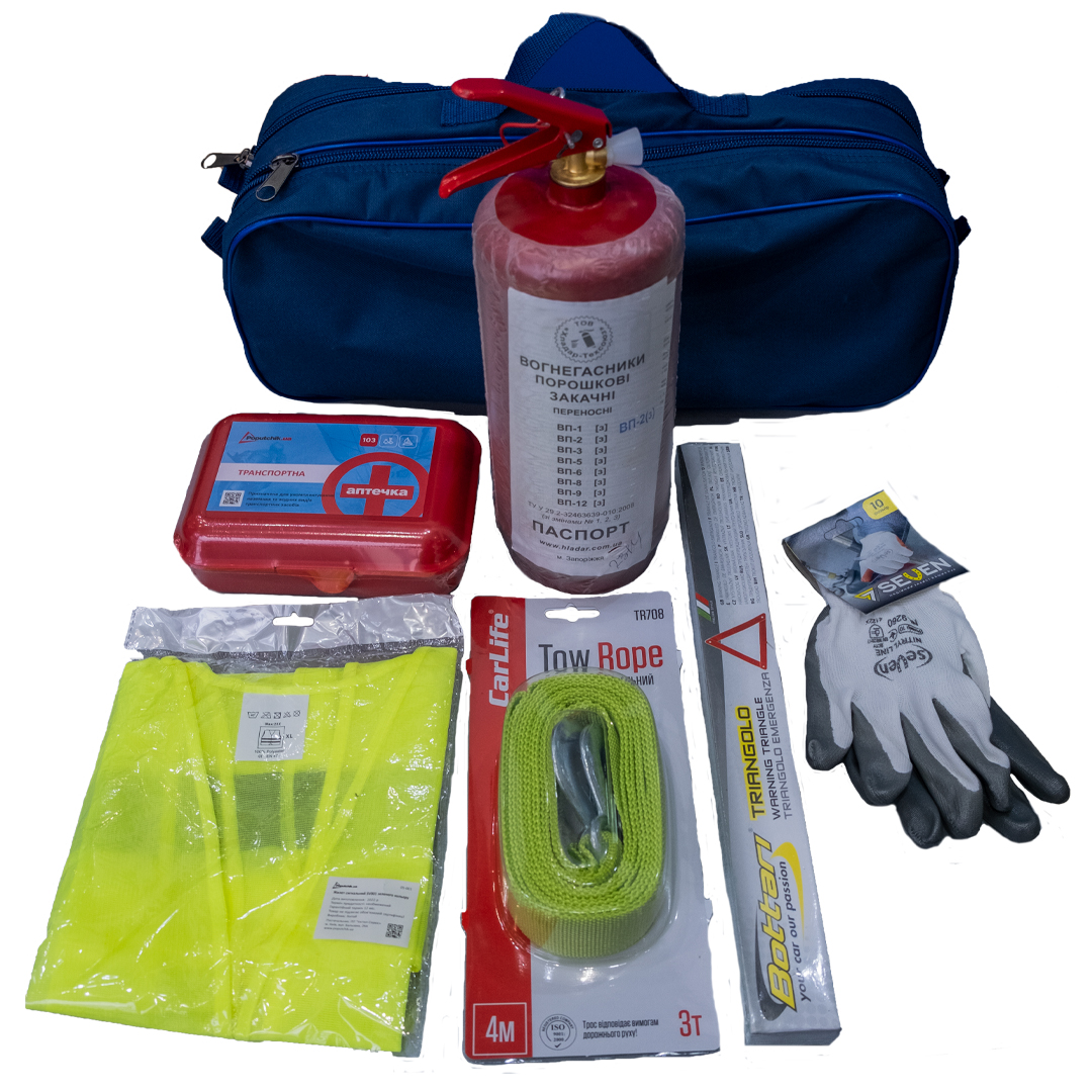 набір автомобільний FORD (аптечка,знак аварійної зупинки,трос буксир.,рукавиці,вогнегасник)